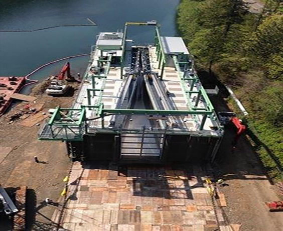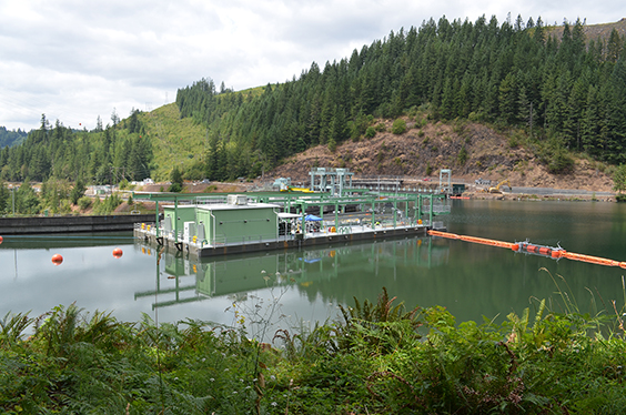 Kleinschmidt teamed with other consultants and led the design efforts for the design of a 1,000-cubic-feet-per-second (cfs) Floating Surface Collector (FSC) in the North Fork Reservoir for downstream fish passage. Fish are attracted into the FSC using 18 submersible attraction flow pumps and then travel down a screen channel which dewaters the fish flow down to 7 to 10 cfs for transport downstream. The project includes the FSC; a guide net to lead fish to the FSC entrance; a transport pipe including a submerged hose, a passage cored through the dam with an emergency shutoff valve, a unique fish friendly flow control facility specifically designed by Kleinschmidt | R2 for this application, 1,200 feet of 20-inch-diameter transport pipe; and a tertiary screening structure (TSS). The TSS combines the fish collected from the FSC with fish from an existing collector and then removes some of the combined flow to not exceed the capacity of the remaining bypass pipe. The TSS includes two plastic traveling screens with automated flow control to remove excess flow and debris from the fish bypass flow. Following design of the FSC and TSS, we provided procurement and construction observation support as well as oversaw the final adjustments and commissioning of the project.